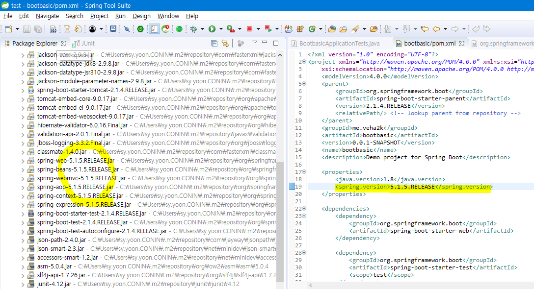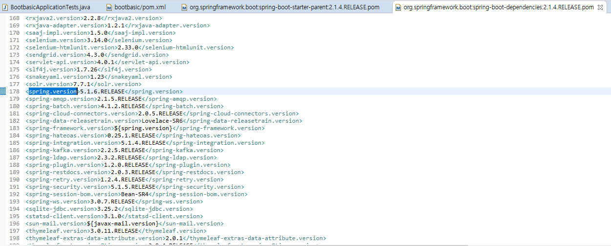 spring version이 default로 5.1.6으로 잡혀있는것을 확인할 수 있다. 이를 customizing 하여 version을 설정하기 위해서는 pom.xml을 수정해준다.