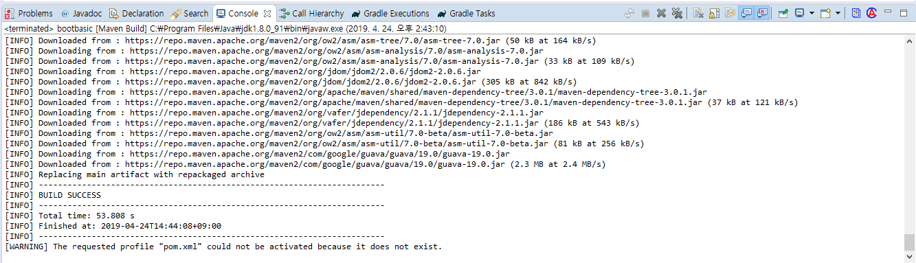 run을 클릭한 후 console을 확인하면 여러가지 jar 파일을 downloading 하는 것을 확인할 수 있다.