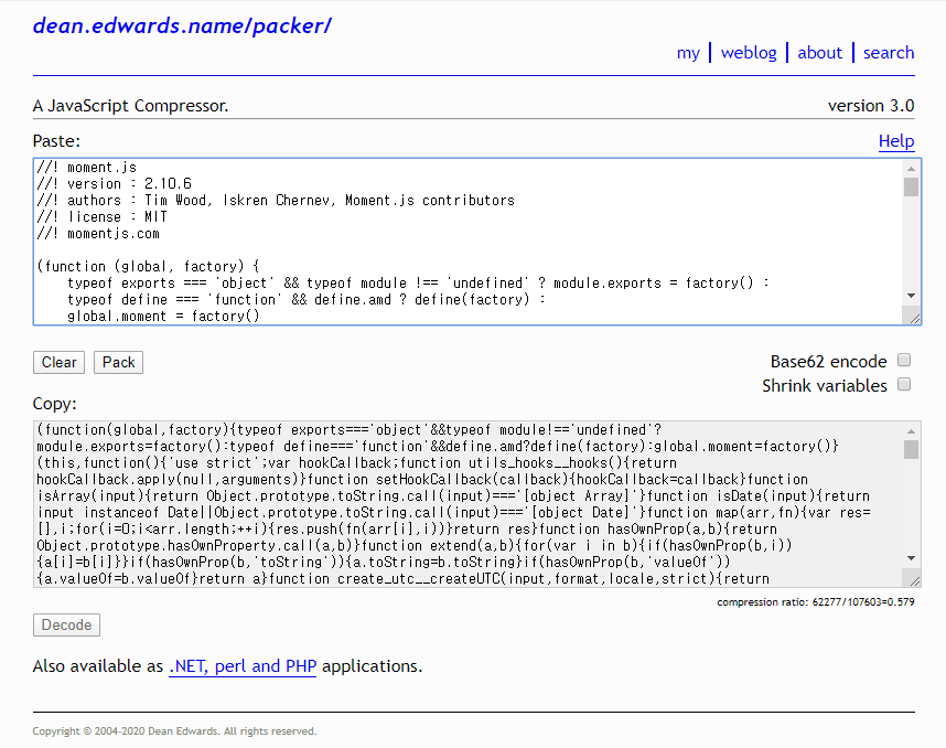 왼쪽은 압축 전, 오른쪽은 압축 후의 모습이다. 주석과 공백을 줄여 소스를 일렬로 나열한 형태가 된다. js를 압축하는 tool은 아래 링크를 클릭한다.
